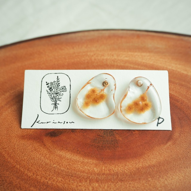お豆のような形をしたピアス/イヤリング クリアな中には、ミモザのドライフラワーを入れました ドライフラワーのため、少しづつ落ち着いた色味に変化します。ご理解の上、変化も含めてお楽しみ下さい。 size(mm): 23×20 ⭐︎7 枚目以降は商品と2wayアイテム"catch"を装着した着用画像となっております。組み合わせをご参考いただき、catchをご購入の場合は各商品ページよりお買い求めください