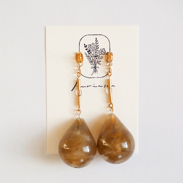 「はちみつ」 こっくりしたイエローでハチミツのような色合い。どんなスタイルにも合わせやすく、ゴールドやホワイト系のピアスとの組み合わせにぴったりです 「くろごま」 グレーとブラックのマーブリングが絶妙なバランスでオシャレな雰囲気に。シルバーやホワイト系のピアスとの組み合わせにぴったりです