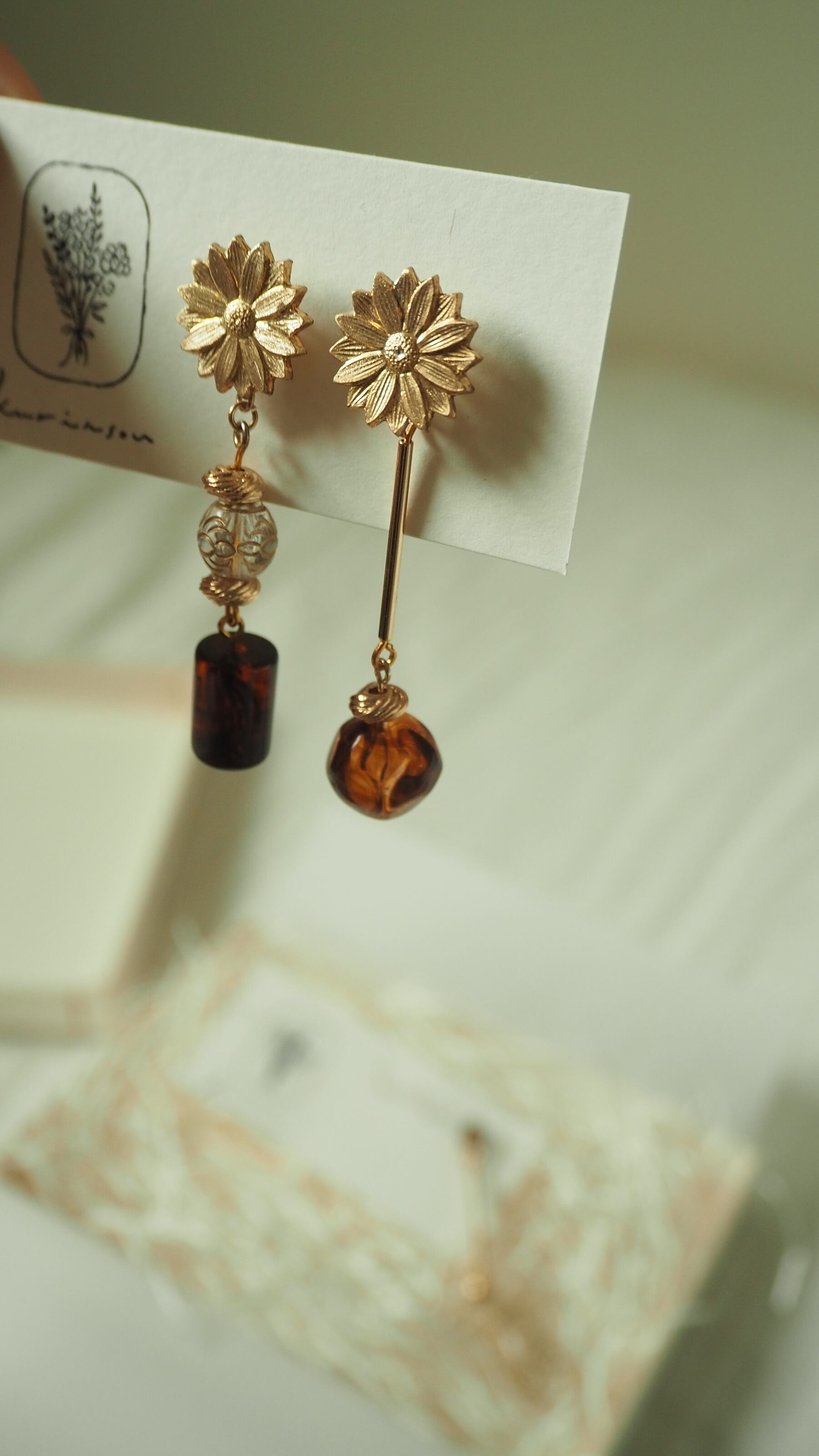 大人っぽいシンプルな感じで、色合いは全体的にべっこう、ゴールド系、小さめで華奢な感じの少し揺れるタイプのキャッチ希望です。