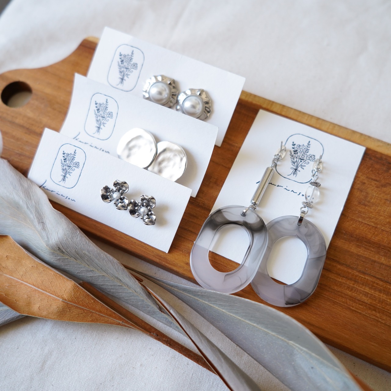 グレーとブラックのマーブリングが絶妙なバランスでオシャレな雰囲気に。シルバーやホワイト系のピアスとの組み合わせにぴったりです